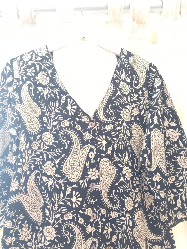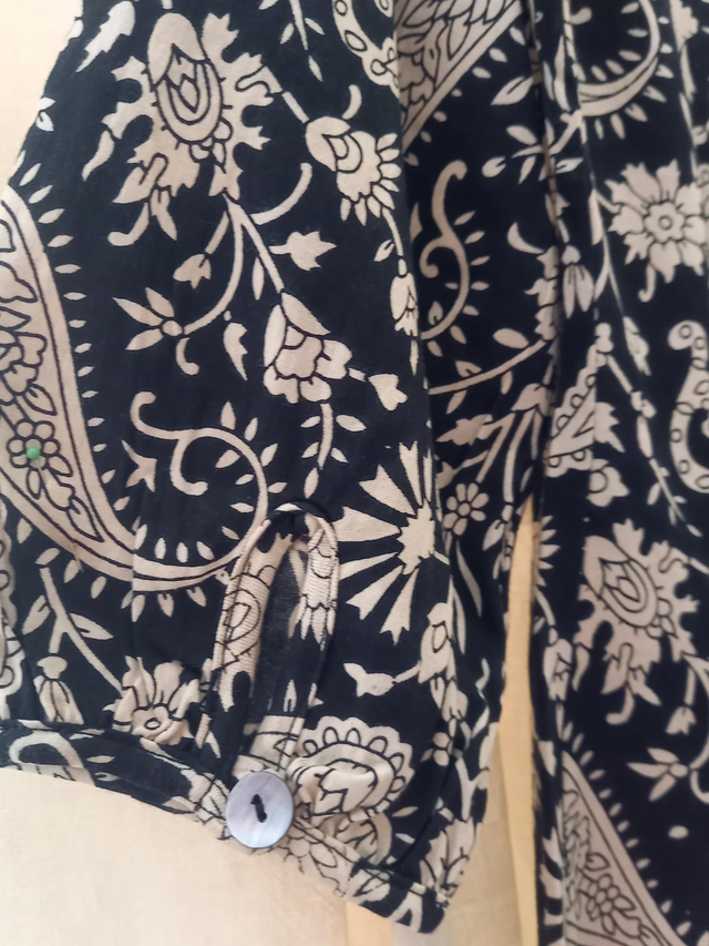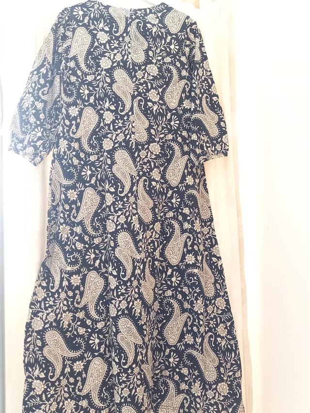 Robe longue imprimée en gersey de coton à manches longues avec fermeture boutons. Coupe évasée.