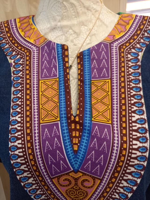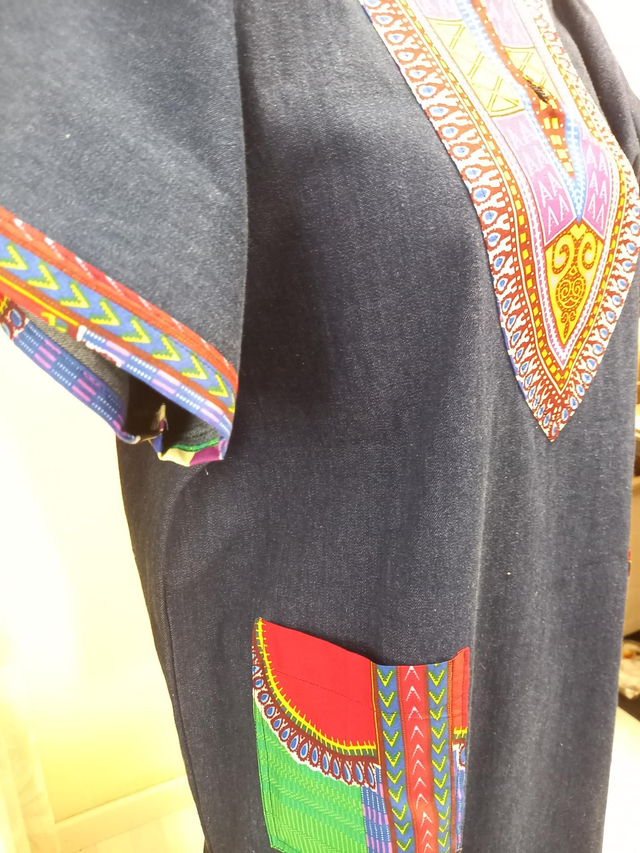 Robe en jean et fantaisie vintage. Manches courtes et poches sur les côtés.