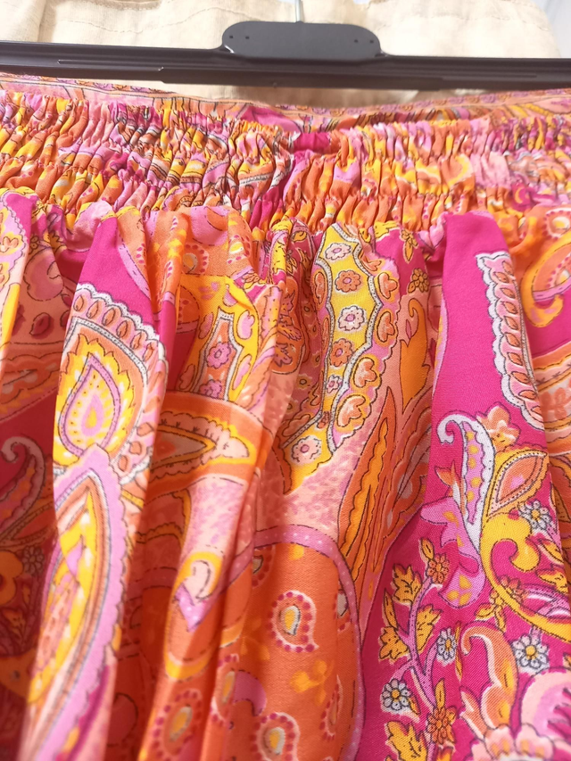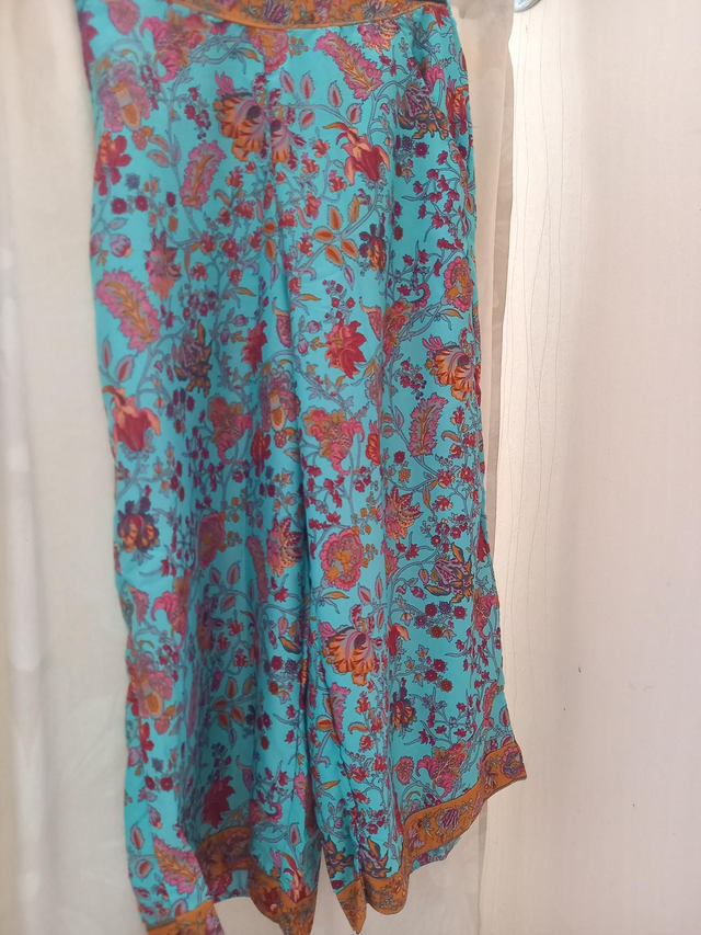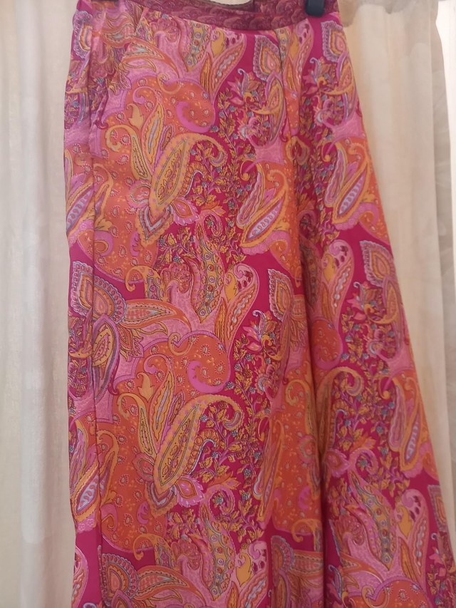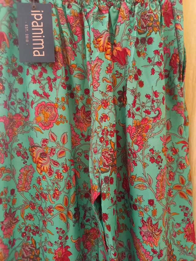 Pantalon large imprimé en polyester. Poches latérales, smocke à la taille dans le dos. Coupe 7/8 ème. Lavage à la main, marque Ipanima